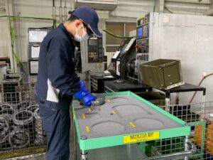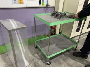 「少しでも段取りを早くできないか?」と班内で意見を出し合い、そこで生まれたアイデアが、型式ごとに専用の段取り用台車を用意することです!